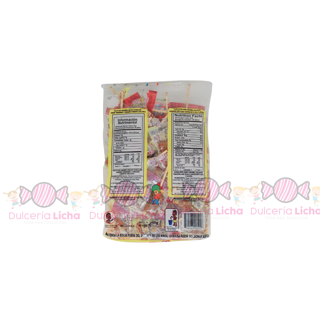 PALETA DE CARAMELO MACIZO ACIDULADO SABOR TAMARINDO, DURAZNO CUBIERTO CON CHILE